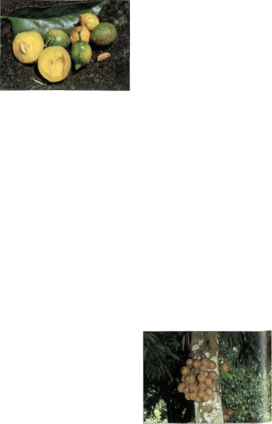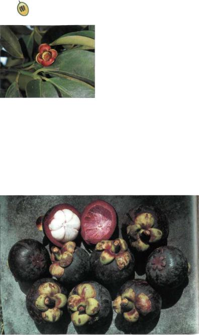 ми листьев, покрытой нежным пушком нижней стороной листа и бледно-желтой мякотью плода. Много сортов со съедобны ми плодами богатого видами рода Garcinj в тропиках Старого Света выращиваются в основном локально, например G. atroviridis Griff, ex T. Anderson на полуострове Малакка с округлыми оранжево-желтыми, очень кислыми плодами с глубокими продольны ми бороздками или G. prainiana King в Таи ланде и Малайзии, плодоносящий широко округлыми, гладкими, ярко-оранжевыми очень ароматными ягодами.