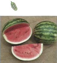 Плод. Арбуз - округлая ягода, достигаю щая размера до 50 см в диаметре, с глад кой, редко опушенной, толсто-мясистой коркой, которая может быть однотонно-зе леной или желтоватой, с продольными ши рокими зелено-бежевыми полосами или пятнами. Плотная, очень сочная, сладкая водянистая мякоть, как правило, красная, реже розовая, оранжевая, желтая или белая и имеет зернистую или волокнистую струк туру. Мякоть содержит несколько сотен пло ских, яйцевидных, гладких, черноватых, коричневых, красных или желтоватых се мян размером 6-15 х 5 -7 мм.