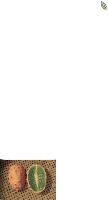 ми, которая покрыта большими толстыми конусообразными колючками. Толщина желтой мякоти достигает 1 см, большую часть огурца занимают многочисленные бе лые плоские семена яйцевидной формы размером около 7 х 4 мм и их стекловид ные, ярко-зеленые, сочные, со сладковатым вкусом огурца ариллусы. Африканский ко лючий огурец в отличие от обычного огур ца едят спелым.