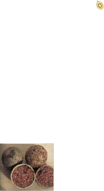 Плод. Плоды феронии слоновой - ок руглые ягоды размером до 10 см с деревя нистой кожурой толщиной до 5 мм, пятни стой серо-коричневой, рубцевато-шерохо ватой.