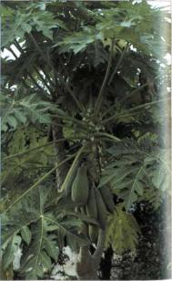 Папайя - вечнозеленое неразветвленное или слабо разветвленное травянистое рас тение высотой до 10 м, как правило дву домное, реже однодомное. Ее толстый, недеревянистый ствол отличается запоми нающимся рисунком из больших треуголь ных листовых рубцов.