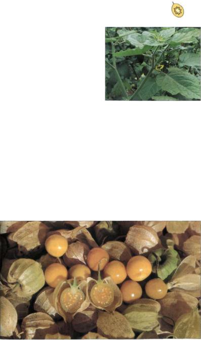 Плод. Приплюснуто-округлые ягоды мексиканской земляной вишни размером 5,5 х 6,5 см до созревания заключены в со ломенно-желтые бумагоподобные про дольно-жилковатые чашечки; они заполня ют весь объем чашечки и могут разорвать ее, набухнув.