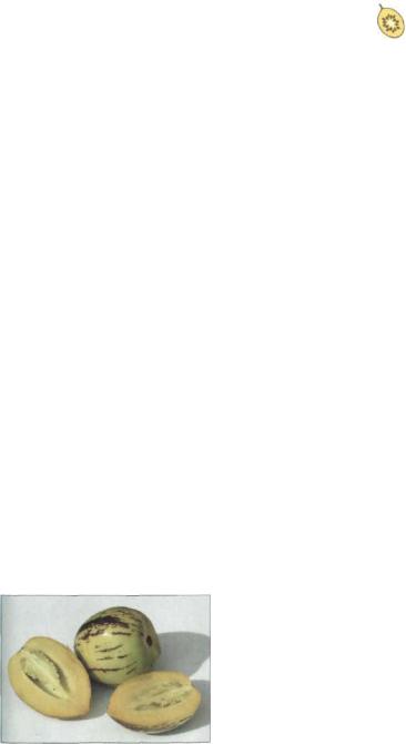 Плод. Плод пепино - яйцевидная, круг лая или овальная ягода размером 10-15 х 8-10 см. Ее тонкая кожица окрашена в жел тый, реже зеленоватый или голубой цвет и покрыта красно-коричневыми пятнами или полосами. Светло-желтая, мягкая, очень сочная сладкая мякоть имеет вкус дыни или груши. В центральной камере плода нахо дятся многочисленные уплощенно-округ- лые бежевые семена размером около Змм; существуют многие бессемянные культур ные сорта.