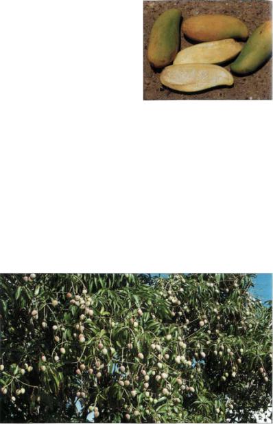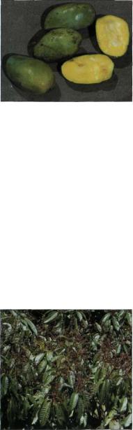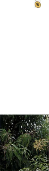 Индийское манго - это вид манго, имею щий наибольшее хозяйственное значение и наиболее широко распространенный также и за пределами Азии. Вечнозеленое дерево достигает в высоту 25 (40) м и образует гу стую, темную, широкую крону. Его супро тивные листья кожистые, гладкие, блестя щие, темно-зеленые, ланцетовидные, по степенно заостряющиеся, у основания кли новидные, иногда до слегка сердцевидных, с цельным краем, иногда волнистым, име ют мощную срединную жилку и 12 - 30 пар боковых жилок. Листовая пластинка имеет длину 15-30 см и ширину ок. 3,5 см. Длина утолщенного у основания черешка составляет 2-6 см. Верхушечные, растопы ренные, конусообразные по контуру соцве тия имеют до 10 000 цветков, из которых лишь небольшая часть опыляется, и из очень немногих вызревает плод. Отдельные цветки имеют короткую ножку, сжаты в ко мочек, со слабым верхушечным листом