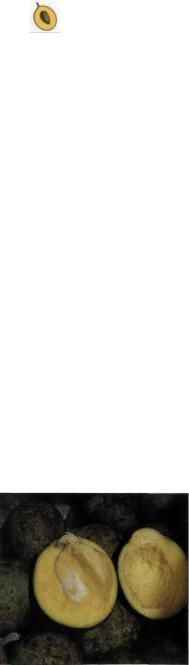 на (экзосмосы). Сочная мякоть плода очень мягкая, волокнистая, окрашена в серножелтый до темного желто-оранжевого цвет; она неприятно пахнет скипидаром и имеет сладко-ароматный вкус с несколько портя щим впечатление смолистым привкусом. Плоская белая косточка крепко держится на мякоти плода и имеет размер 8 х 4 х 2 см.