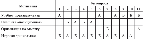 В случаях, когда ребенок дает 5 или 6 ответов, относящихся к трем категориям учебных мотивов, и 5 или 6 ответов, свидетельствующих о преобладании дошкольных видов деятельности, делается вывод о примерном равенстве этих типов мотивации.