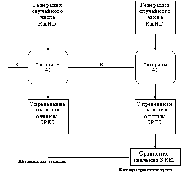 Центр коммутации сети передает случайный номер RAND на абонентскую станцию, которая вычисляет значение отклика SRES, вычисленного сетью. Если оба значения совпадают, АС может осуществлять передачу сообщений. В противном случае связь прерывается, и индикатор АС должен показать, что опознавание не состоялось.