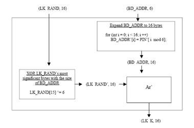 Для создания ключа связи Kab устройства обмениваются 128-битными словами LK_RAND(A) и LK_RAND(B), генерируемыми случайным образом. Далее следует побитовый XOR с ключом инициализации Kinit. И снова обмен полученным значением. Затем следует вычисление ключа по алгоритму E21.Для этого необходимы величины:_ADDR;