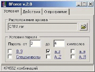 Подбирает пароль используя комбинации. На картинке показан взламываемый архив “1.rar” , длина пароля от 3 до 4 символов. Подбирают только строчные латинские буквы (можно отметить сразу все пункты), и в самом низу показано число комбинаций.