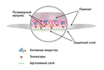 форма, представляющая собой небольшого размера пленку. ТТС в основном выпускаются в форме пластырей, соответственно они должны отвечать параметрам, характерным для пластырей. Они должны обладать хорошей липкостью, плотно прилегать к коже и не раздражать ее. В составе трансдермальных терапевтических систем есть основа и лекарственное вещество.