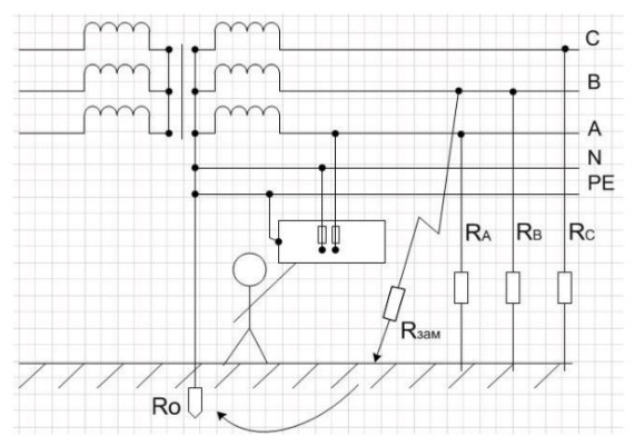 Напряжение на корпусе при обрыве нулевого провода и замыкании на корпус без повторного заземления нулевого провода