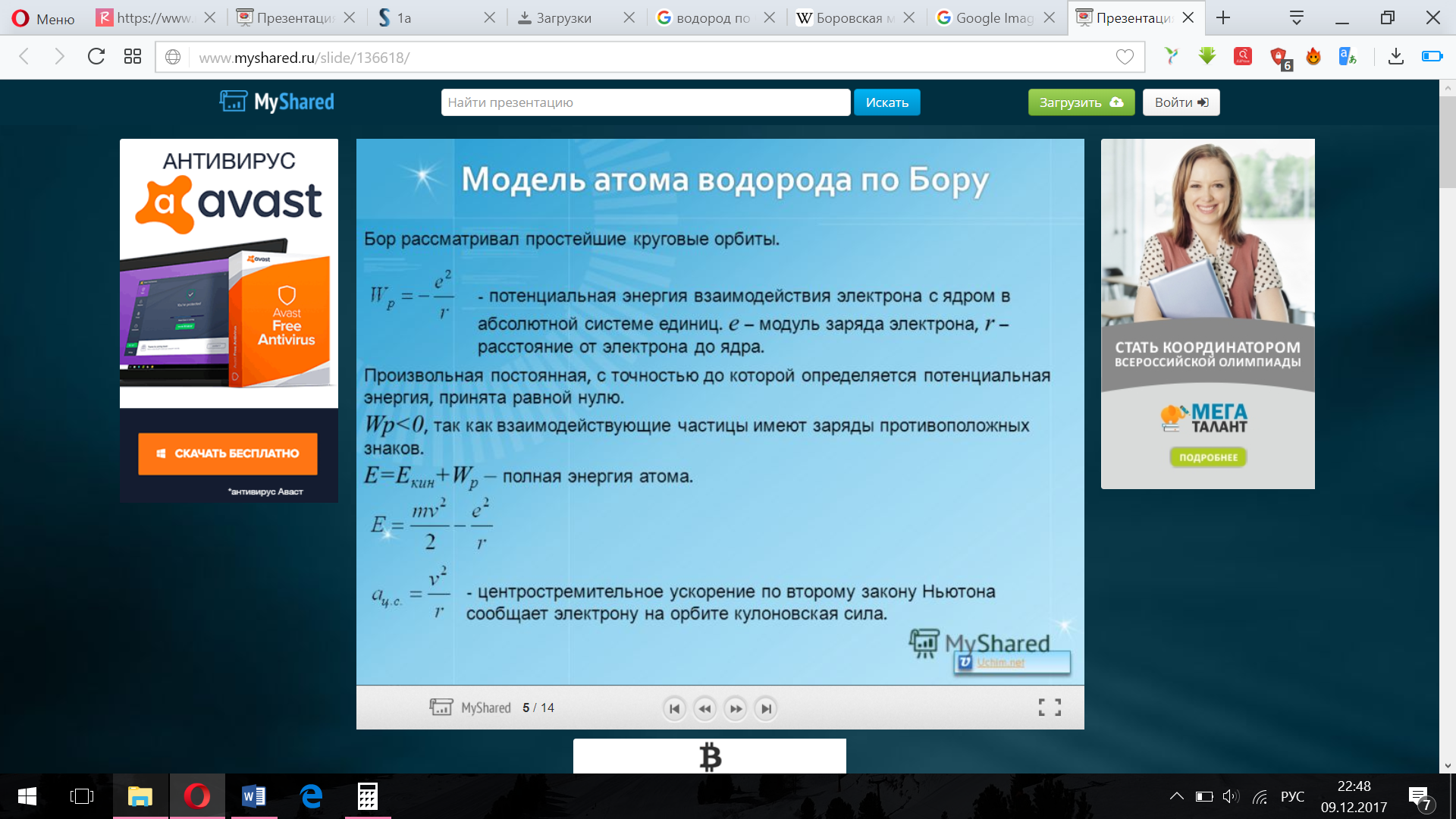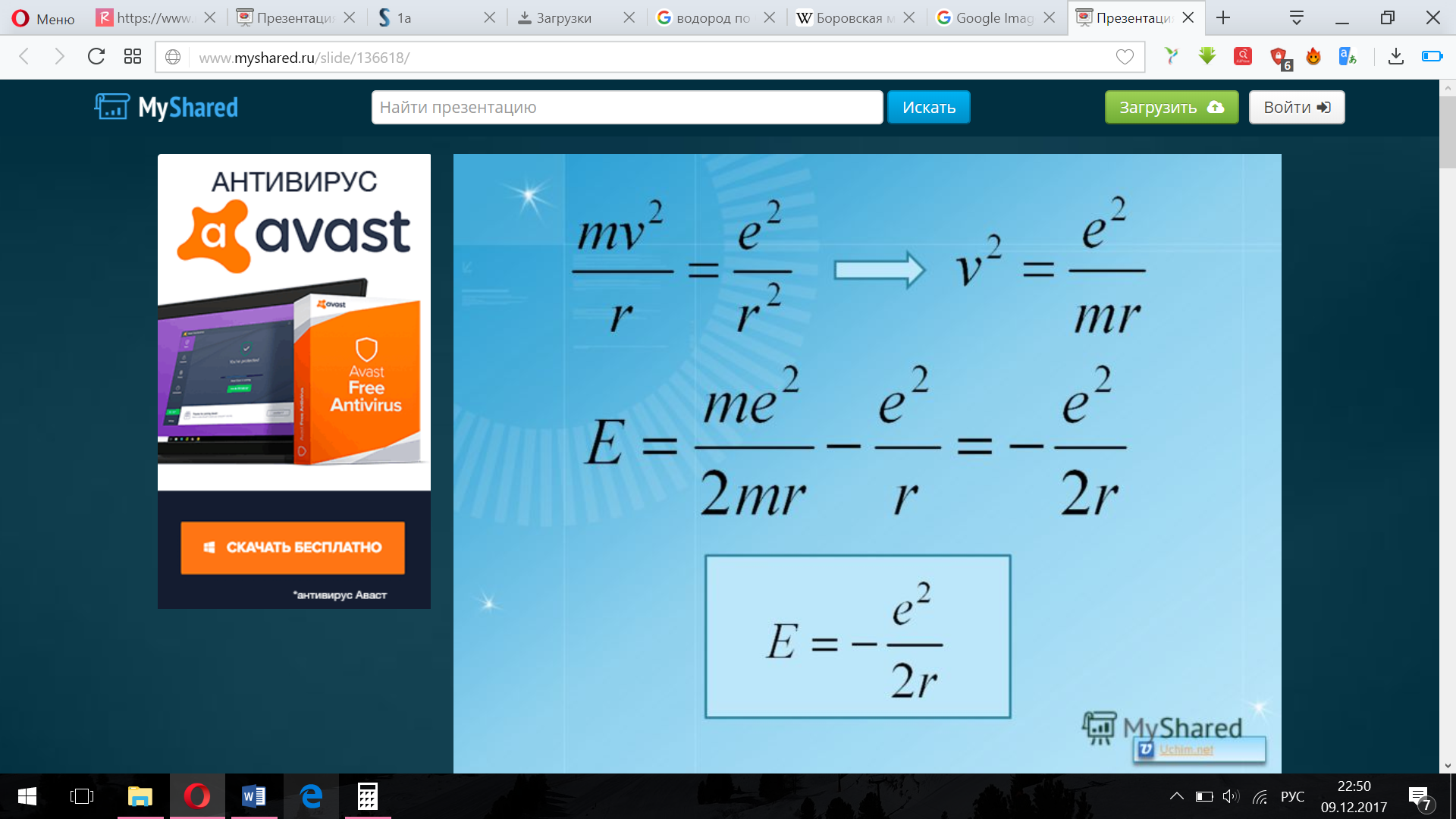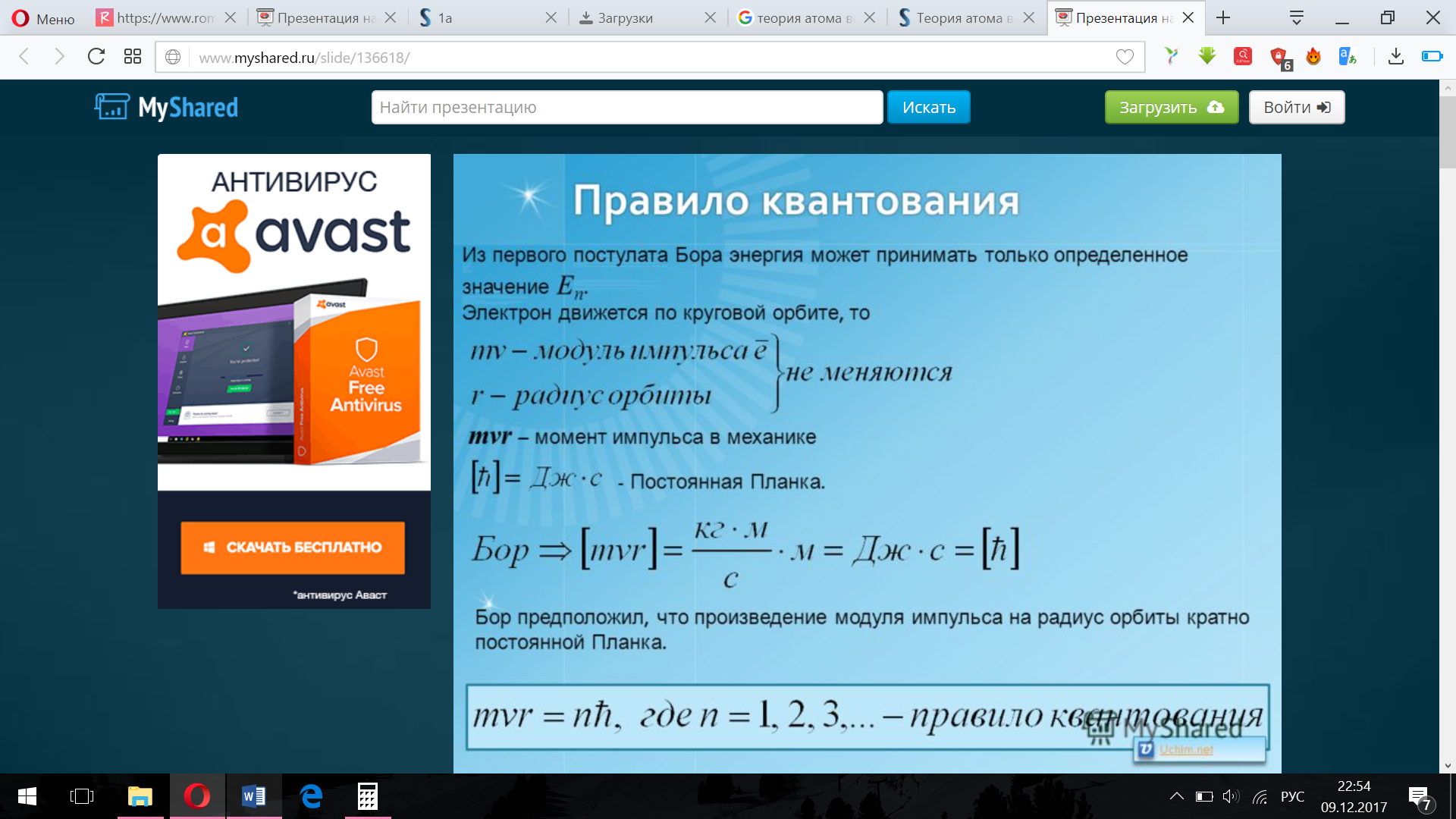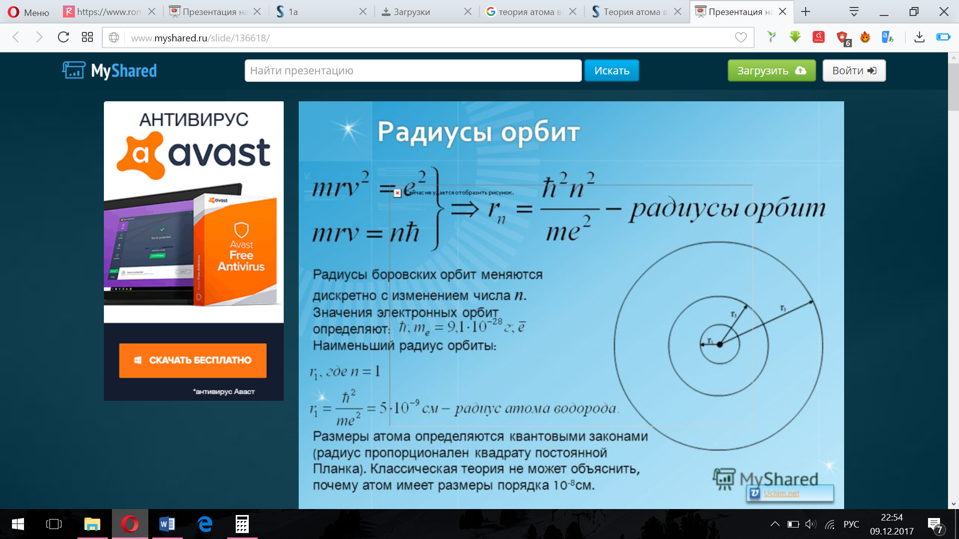 В качестве последнего примера безуспешных попыток классической физики дать полную теорию физических явлений рассмотрим атом водорода. Согласно классической модели Резерфорда атом водорода состоит из одного электрона, вращающегося вокруг положительно заряженного малого атомного ядра. Эта классическая модель не смогла объяснить два основных экспериментальных факта: а) стабильность атома водорода б) структуру излучаемого им электромагнитного спектра.В основу теории, исходящей из ядерной модели атома и объясняющей его основные опытные свойства и, прежде всего устойчивость и дискретный спектр излучения, Н. Бор положил два постулата..