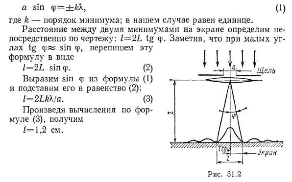 На щель шириной a=0,1 мм нормально падает параллельный пучок света от монохроматического источника (λ=0,6 мкм). Определить ширину l центрального максимума в дифракционной картине, проецируемой с помощью линзы, находящейся непосредственно за щелью, на экран, отстоящий от линзы на расстоянии L=1 м. Центральный максимум интенсивности света занимает область между ближайшими от него справа и слева минимумами интенсивности. Поэтому ширину центрального максимума интенсивности примем равной расстоянию между этими двумя минимумами интенсивности. Минимумы интенсивности света при дифракции от одной щели наблюдаются под углами φ, определяемыми условием