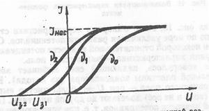 Как уже говорилось, падающий свет выбивает электроны из отрицательной пластины конденсатора (из катода). В отсутствие электрического поля — при U=0 большинство вырванных электронов (хотя и не все) долетают до другой пластины. При положительной разности потенциалов, т. е. при ускоряющем электрическом поле, сила фототока слегка увеличивается, а затем достигает своего предельного значения. Предельное значение фототока носит название тока насыщения — Iнас. Ток насыщения соответствует случаю, когда все вырванные светом электроны достигают анода.