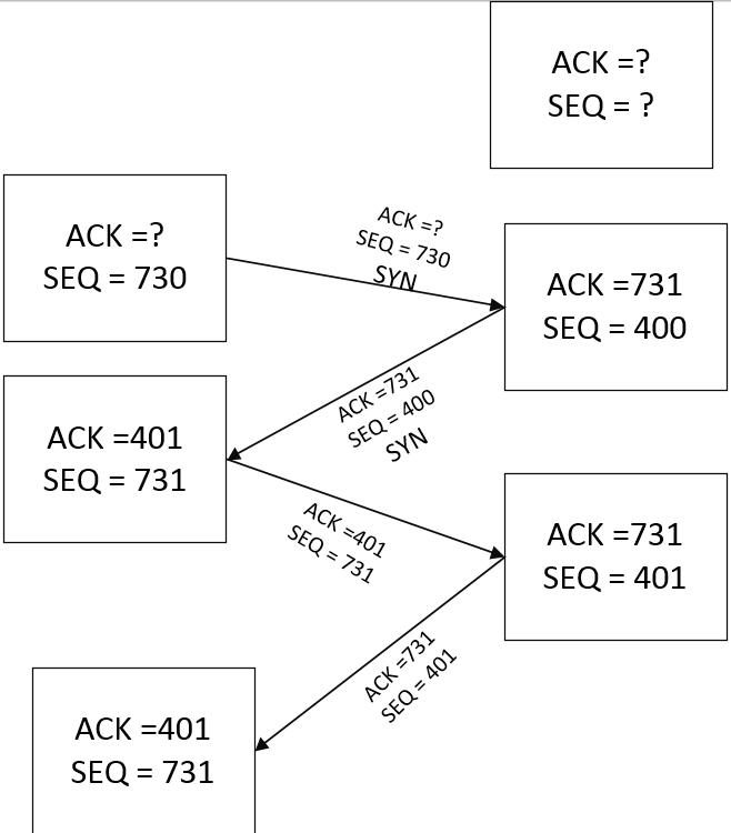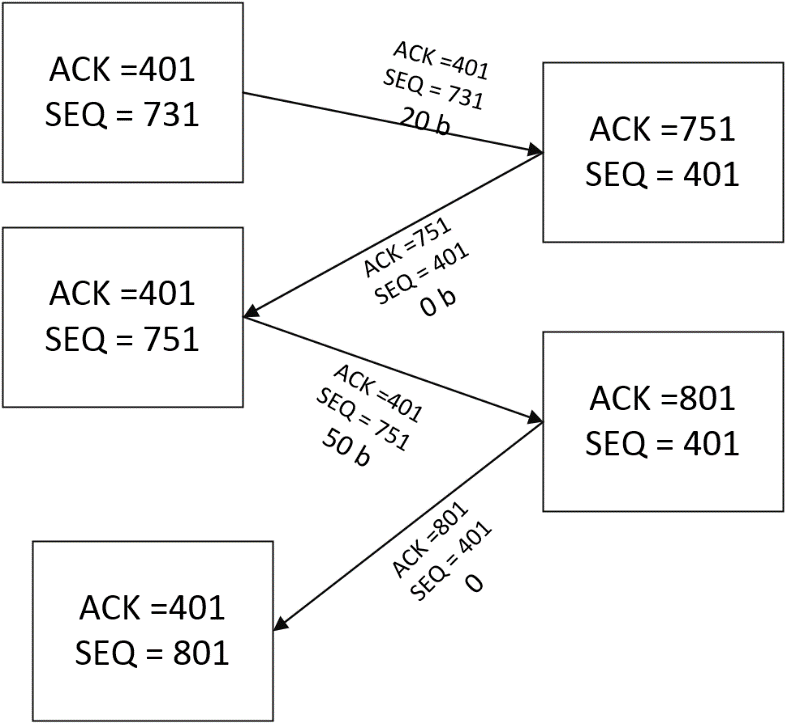Есть рабочая станция, есть некий сервер. На рабочей станции есть ACK = 401. SEQ = 731. У сервера есть ACK 731, SEQ = 401 (этого мы добились при синхронизации). Далее станция отправляет, предположим 20 байт и ACK = 401, SEQ = 731. Сервер сделает следующее: установит ACK 751 (731+20 байт), SEQ 401 – следующий байт с которого мы ожидаем прием. Передаст соответствующий ACK 751, SEQ = 401 и 0 байт, т. к. ничего никуда не передаем, а просто шлем некое подтверждение, что все приняли. На станции устанавливаем ACK =401, SEQ = 751 и передаем следующие 50 байт (например). На сервере мы переустанавливаем ACK = 801 (751+50) и SEQ=401 и отправляем эти данные станции + 0 байт. После получения данного сообщения станции станция переустанавливает себе ACK =401 и SEQ = 801.