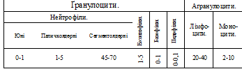 Лейкоциты, или белые кровяные тельца – это клетки с ядрами, не содержащие гемоглобин и играют важную роль в защите организма от микробов, вирусов, патогенных простейших, т. е. обеспечивают иммунитет. У взрослых в крови содержится 4 – 9 Х 109/л (4000 – 9000 в 1мкл.) лейкоцитов, то есть их в 500 – 1000 раз меньше, чем эритроцитов. Но, в отличие от эритроцитов, численность которых в крови здорового человека относительно постоянна, численность лейкоцитов значительно колеблется в зависимости от времени суток и функционального состояния организма. Лейкоциты делят на 2 группы: ґранулоцити (зернистые), к которым относятся нейтрофилы, эозинофилы и базофилы; аґранулоцити (незернисті) – лимфоциты и моноциты. При оценке изменений количества лейкоцитов в клинике решающее значение имеет показатель изменения соотношений между отдельными группами и формами лейкоцитов, в меньшей степени – их числа. Процентное соотношение отдельных форм лейкоцитов называют лейкоцитарной формулой, или лейкограмою.