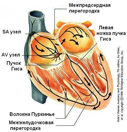 Скорость проведения возбуждения: предсердие - 1 м/сек, атриовентрикулярный узел - 0,2 м/сек, пучок Гиса - 4 м/сек, волокна Пуркинье - 3 м/сек, типичный миокард - 0,8 м/сек.