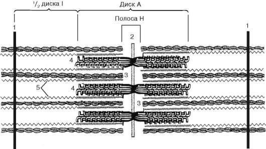 Рисунок 2. Строение саркомера (схема). 1 – линия Z, 2 – линим M, 3- филаменты актина, 4 – филаменты миозина, 5 – фибриллярные молекулы татина (по Б.Албертс, Д. Брей, Дж. Льюис и др., с изменениями).