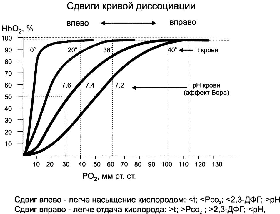 Избыток СО2 и ацидоз сдвигает кривую диссоциации вправо, а недостаток СО2 и алкалоз – влево(эффект Бора). В легких реакция взаимодействия гемоглобина с кислородом идет в сторону образования оксигемоглобина, т.к. венозная кровь имеет напряжение кислорода 40 мм рт. ст., а в альвеолярном воздухе парциальное давление кислорода составляет 100 мм рт. ст.