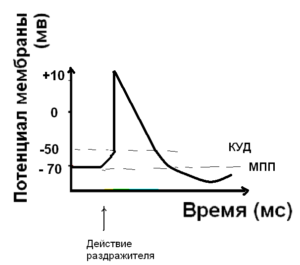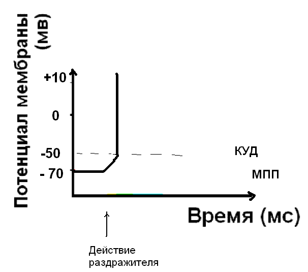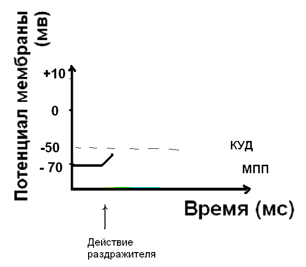 КУД - критический уровень, величина мембранного потенциала, при достижении которой открываются быстрые, потенциал зависимые натриевые каналы и происходит перезарядка мембраны за счет поступления в клетку положительных ионов натрия. Чем выше электроотрицательность мембраны, тем труднее деполяризовать ее до КУД, тем менее возбудима такая клетка.