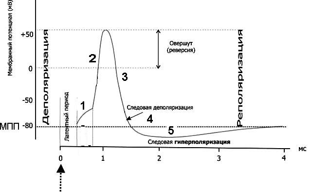 Следовая гиперполяризация. Калиевые каналы остаются открытыми и дополнительный ток калия гиперполяризует мембрану. После этого клетка возвращается к исходному уровню МПП. Длительность ПД составляет для разных клеток от 1 до 3-4 мс.