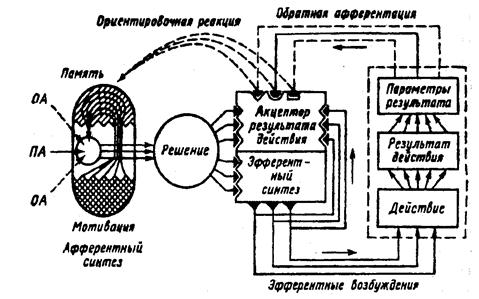 3. Акцептор результата действия – включаются в работу эфферентные структуры, происходит осуществление самого действия. Обратная афферентация сигнализирует о результатах, которые сравниваются с запрограммированными в акцепторе действия. Если цель достигнута система перестает функционировать.