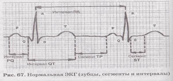 На ЭКГ в норме различаят зубцы (Р, Q, R, S, Т), сегменты — расстоѐниѐ между зубцами (РQ, SТ, ТР) и комплексы (Р — предсердный и QRS, QRST, (2К8Т — желудочковый). Отрезки ЭКГ, состоѐщие из сегмента и прилегаящего зубца, называятсѐ интервалами (РQ, QТ, SТ, RR).