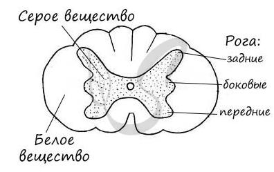 Спинной мозг располагается в позвоночном канале и состоит из двух симметричных половин, разделенных спереди срединной щелью, сзади – срединной бороздой. Спинной мозг характеризуется сегментарным строением, с каждым сегментом связана пара передних и пара задних корешков. В спинном мозге различают серое вещество (расположено в центральной части) и белое вещество (находится на периферии). Серое вещество на поперечном разрезе имеет вид бабочки и включает парные - передние - боковые - задние рога. На самом деле они представляют собой непрерывные столбы, идущие вдоль спинного мозга