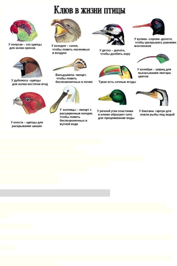 Пинцет с расширенным концом - для ловли беспозвоночных в мутной воде Долото - долбить кору, раскрывать раковины моллюсков Пластинки в клюве - сито для процеживания Шипцы - высасывание нектара Гарпун - ловля рыбы под водой