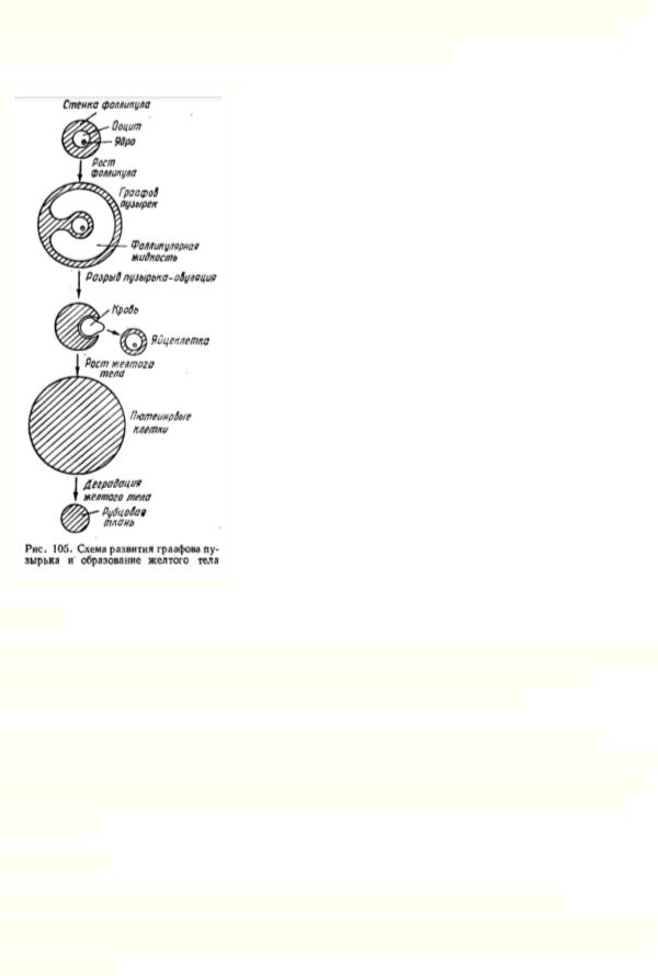 Затем фолликул превращается в граафов пузырек, выдающийся на поверхности яичника (рост ооцита, накопление желтка, разрастание оболочки, образование пространства с жидкостью между ней и ооцитом).