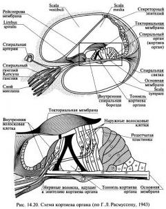 На рис. 14.20 показан поперечный разрез улитки, на котором видны три камеры: срединная лестница scala media, лестница предверия scala vestibuli и барабанная лестница scala tympani. Лестница предверия и барабанная лестница соединены между собой у верхушки улитки с помощью геликотремы. Срединная лестница отделена сверху мембраной Рейснера, а снизу (от барабанной лестницы) базилярной (основной) мембраной. Базилярная мембрана у человека длиной около 32 мм суживается по направлению от верхушки к стремени с 0,5 мм до 0,1 мм. У основания она толще, чем у верхушки.