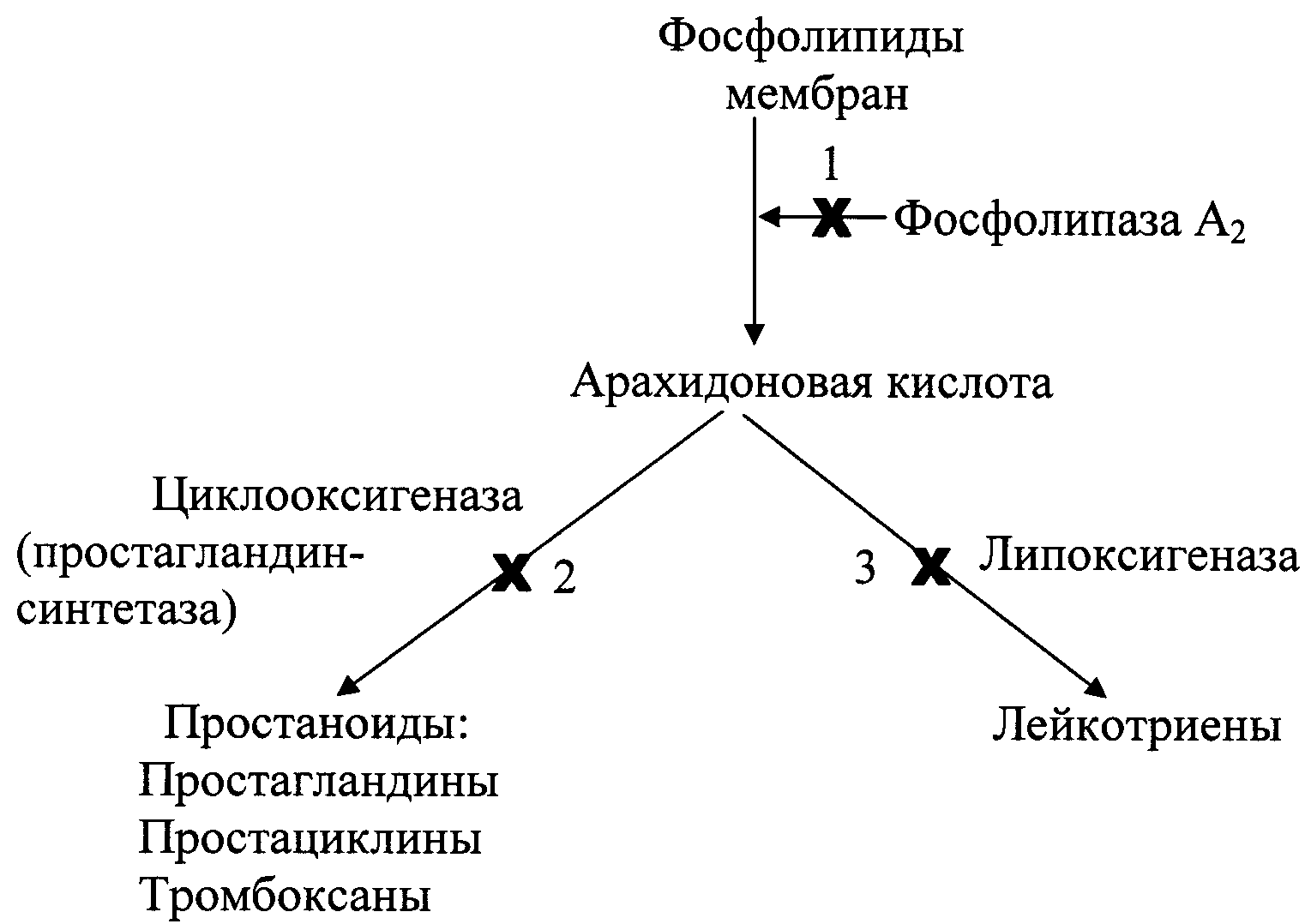 Ингибиторы: 1 – глюкокортикоиды; 2 – ацетилсалициловая кислота (аспирин), нестероидные противовоспалительные средства (индометацин и др.); 3 – пиразолон, витамин Е, витамин Р (рутин)