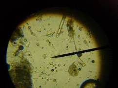 При круговом движении яйца и личинки собираются у конца стеклянной палочки. По окончании закручивания палочку с каплей взвеси быстро вынимают, каплю помещают на предметное стекло, а затем микроскопируют.
