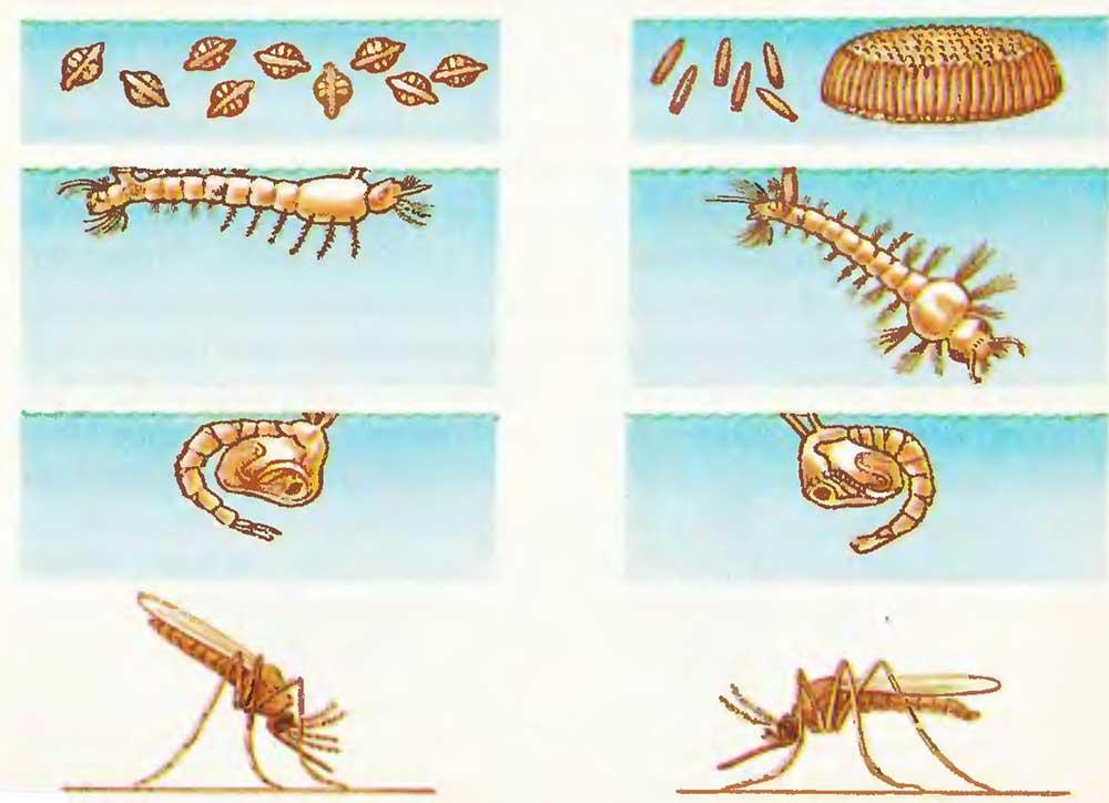 Личинки малярийного комара отличаются короткими дыхательными трубочками и горизонтальным положением тела, в то время как у обыкновенного комара личинки имеют дыхательный сифон и держаться наклонно к поверхности вода вниз головой.