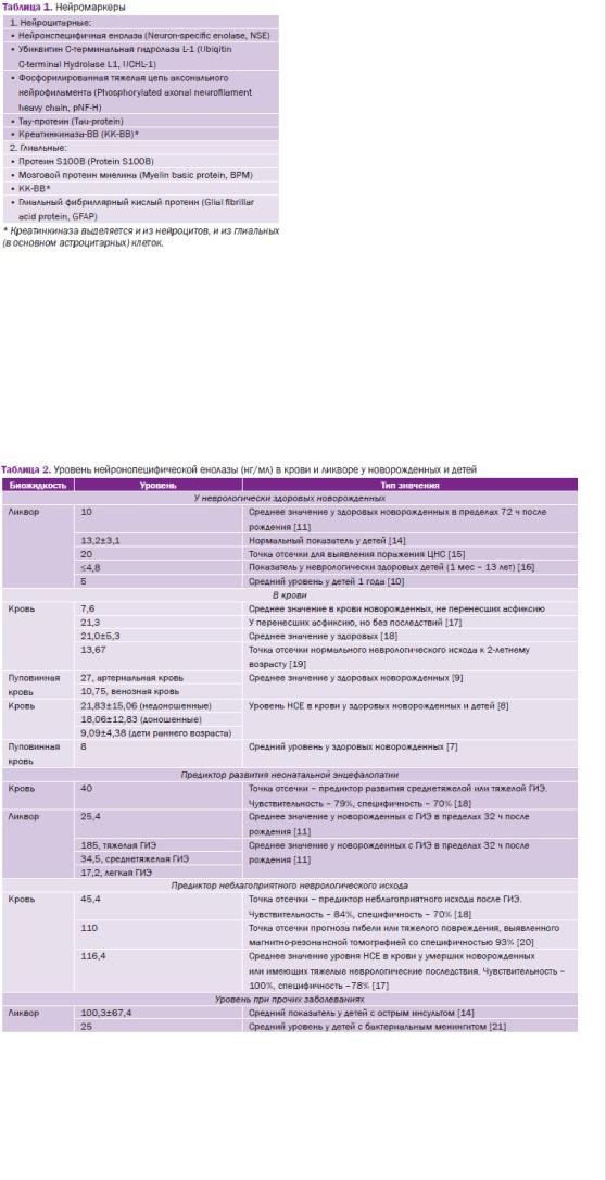 поражения ЦНС относится выявление биомаркеров нейронального повреждения (нейромаркеров) в биожидкостях новорожденного. Нейромаркеры - специфические продукты деградации нейрональной ткани, уровень которых повышается при различных видах поражения ЦНС, 8 из них в той или иной степени изучены в неонатологии (табл. 1). К нейромаркерам не относятся метаболиты, возбуждающие аминокислоты, метаболиты свободнорадикального повреждения, цитокины, факторы роста сосудов и эндотелия, эритропоэтин, а также прочие ве- щества, уровень которых изменяется в крови и ликворе под воздействием гипоксии, ишемии и воспаления.
