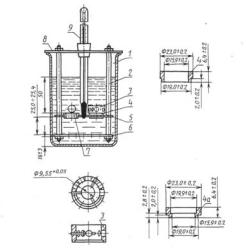 1- стеклянный стакан; 2-штатив; 3- накладка; 4-латунное гладкое кольцо; 4а-латунное ступенчатое кольцо; 5-верхняя пластинка; 6- нижняя пластинка; 7-шарик; 8-крышка; 9-термометр