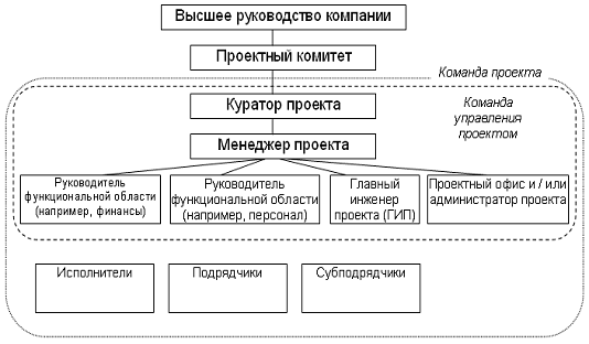 Все вышеперечисленные роли образуют команду управления проектом, которая входит в команду проекта. Также участниками команды проекта являются исполнители, как из числа штатных сотрудников компании, так и нанятые специально для реализации конкретного проекта. Иногда в нее включают подрядчиков и субподрядчиков.