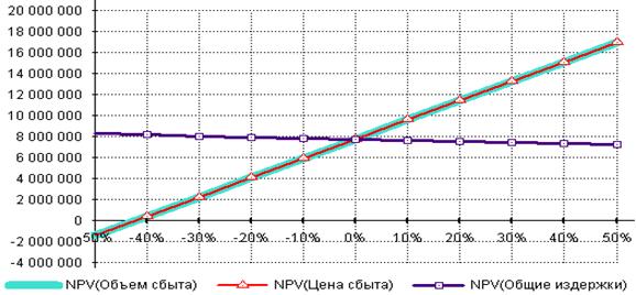 Анализ чувствительности проводился по критериям: объем сбыта, цена сбыта, , общие издержки.