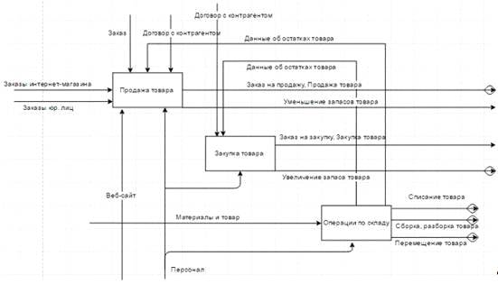 Из приведенной диаграммы можно сделать вывод, что основными видами деятельности в организации являются, как уже было оговорено ранее, процессы закупки, продажи и различные операции по складу. По данной диаграмме можно выделить существующие проблемные участки бизнес-процессов организации, а именно при совершении продажи или закупки товара, нужно чтобы происходила автоматическая корректировка остатков. Мной было выяснено, что данная корректировка на текущий момент происходит так: бухгалтер на складе, при совершении закупки или продажи по телефону передает данные оператору интернет-магазина, которые вручную правит данные в системе Magento. Зачастую заказы, получаемые от юридических лиц, содержат более двадцати позиций товаров с различным количеством, что в процессе передачи информации по телефону повлечет ошибки в данных о запасах в системе Magento. Если же в интернет-магазине будут не актуальные данные о запасах, то многие потенциальные клиенты уйдут, не купив ни одной вещи, что напрямую отразиться на прибыли компании.