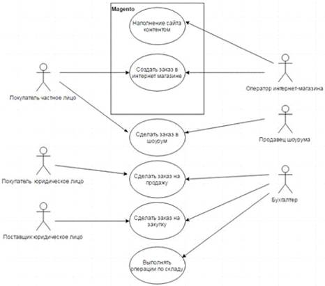 Диаграмма вариантов использования позволяет взглянуть на деятельность организации с еще более глубокого уровня декомпозиции, рассматривая ранее выделенные три процесса в разрезе действующих лиц организации. Те функции, которые на данный момент реализованы в системе Magento выделены в соответствующем прямоугольнике. Все действия, которые находятся вне данного прямоугольника, выполняются пользователями вручную и именно в этом, по мнению руководства компании и кроется основная проблема. Как уже было оговорено ранее, такой метод построения работы усложняет мониторинг текущих остатков на сайте. Связано это с проблемой передачи информации между работниками, которые еще и территориально разделены друг от друга, магазин находится в Москве, а склады в Подмосковье.