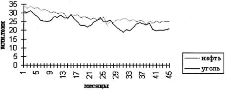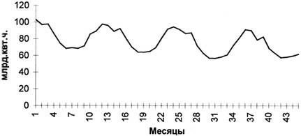 На рисунках 1 и 2 приведены примеры временных рядов, иллюстрирующие присутствие в них указанных компонент. Графики месячных временных рядов производства промышленной продукции наглядно демонстрируют устойчивые сезонные колебания при снижающемся тренде, причем на последнем участке темпы падения производства заметно снижаются.