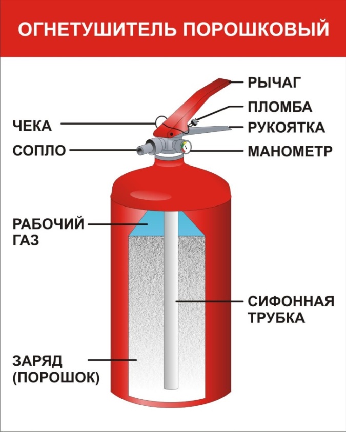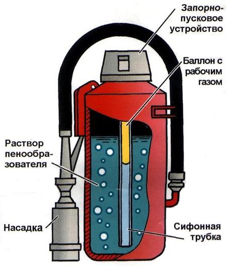 При срабатывании ЗПУ прокалывается заглушка баллона с рабочим газом, газ по трубке поступает вниз баллона и создает избыточное давление, после чего порошок вытесняется по сифонной трубке вверх. ОП бывают закачные и со встроенным газовым источником давления. Включать необходимо через 5 секунд после нажатия ЗПУ.