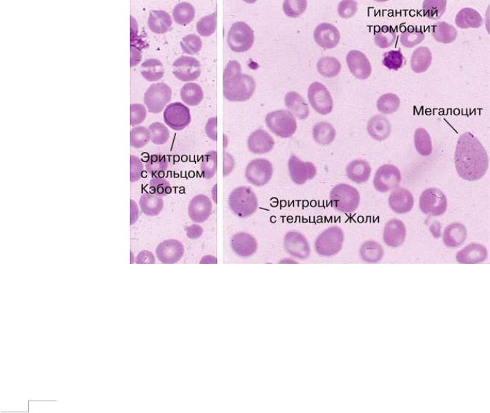 гиперхромной гипорегенераторной анемией различной степени тяжести определяется морфологически измененные эритроциты - макроциты и мегалоциты, с патологическими включениями в форме телец Жолли и колец Кебота (рис. 17). Указанные структуры представляют собой терминальные ядерные элементы в клетке. Помимо этого возможно обнаружение специфической базофильной пунктуации эритроцитов, возникающей в результате гиперпродукции РНК. Что касается других элементов крови, то изменения их вариабельны. Нередко встречается снижение количества нейтрофилов, которые при этом приобретают увеличенные размеры и гиперсегментоядерность. Существуют клинические наблюдения агранулоцитоза на фоне В12-дефицитной анемии, однако они достаточно редки. Тромбоцитарный росток повреждается в меньшей степени, поэтому регистрируемая тромбоцитопения, как правило, не проявляется клинически.