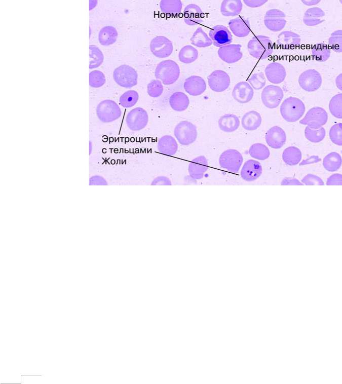 ∙в мазке крови обнаруживается микроцитоз, анизоцитоз, ядерные эритрокариоциты, мишеневидные эритроциты; могут появляться патологические включения (тельца Жолли) (рис.5).