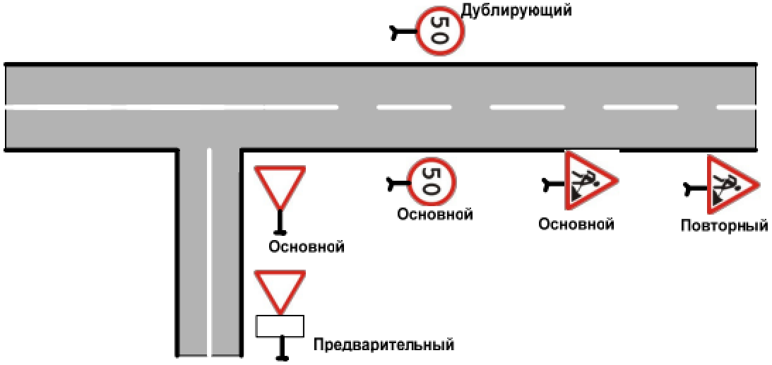 Дублирующий: Знак, установленный в том же поперечном сечении дороги, что и основной знак, служащий для повышения надежности восприятия информации участниками движения.
