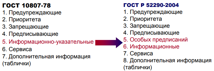 Требования по размещению знаков каждой группы подробно приведены в ГОСТ Р 52289-2004. Общее правило: