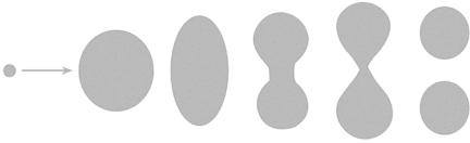 му эллипсоида (рис. 4.7). При этом возрастает поверхностная энергия (увеличивается площадь поверхности капли) и уменьшается энергия электростатического взаимодействия протонов (увеличивается среднее расстояние между протонами в ядре). Капля начинает совершать колебания. Если энергия возбуждения ядра-капли оказывается больше энергии, необходимой для деления (порог деления), ядро разделяется на два осколка.