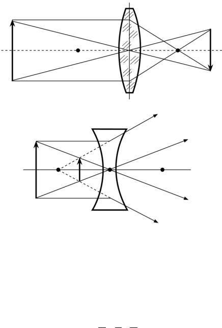 Собирающие линзы (рис. 1.12, а) дают прямое или перевернутое, действительное или мнимое, уменьшенное или увеличенное изображение предмета в зависимости от его положения относительно линзы. Рассеивающие линзы всегдадают уменьшенное прямоемнимоеизображение(рис. 1.12, б).