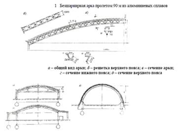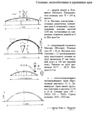 Металлические арки выполняются сплошного и решетчатого сечения. Высота ригеля сплошного сечения арок применяется в пределах 1/50-1/80 , решетчатого 1/30-1/60 пролета. Отношение стрелы подъема к пролету у всех арок находится в пределах 1/2-1/ 4 при параболическом очертании кривой и 1/4-1/8 при круговой кривой. На рис. 8, а, рис. 9, рис. 1, рис. 10, а, б, в, представлены примеры из практики строительства.