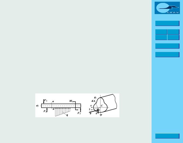 Изобразим балку (рис. 6.7.1). На рисунке показаны активные и реактивные силы. После того, как реакции найдены, опоры можно не изображать. Рассмотрим любое сечение − . Выделим площадку